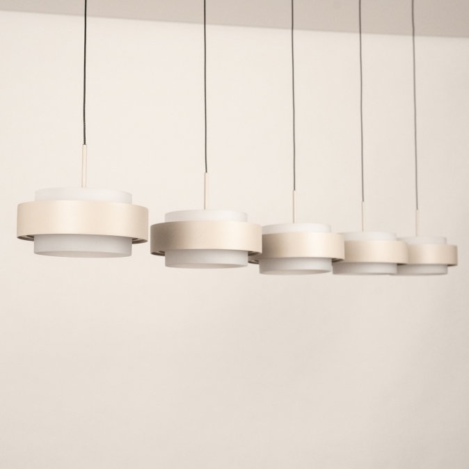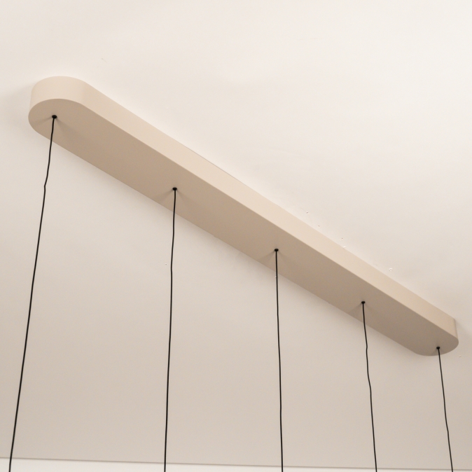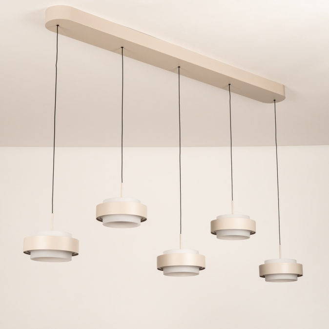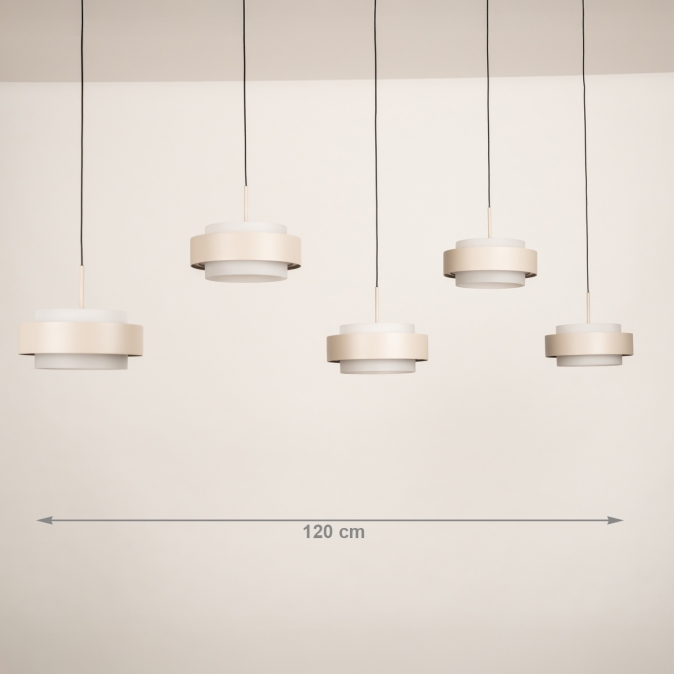 Deze 5-lichts hanglamp heeft een langwerpige plafondplaat van 120 cm en levert in totaal 5250 lumen. Dankzij de Dim to Warm-techniek wordt het licht warmer als je dimt: van 3000 naar 2200 Kelvin. Met slechts 18 Watt verbruik per kap is deze lamp energiezuinig én stijlvol. De lamp is uitgevoerd in beige gespoten metaal (RAL 120-6) en is dimbaar met een LED-dimmer (niet inbegrepen), zodat je altijd de juiste sfeer kunt creëren.Lichtwaarden