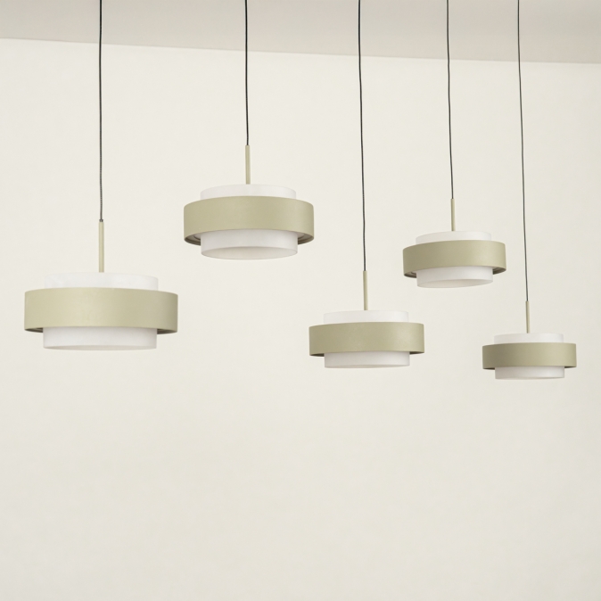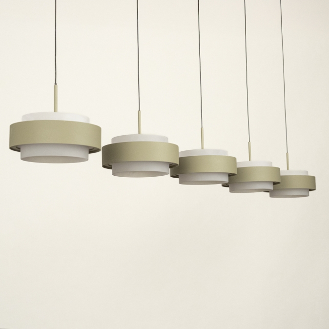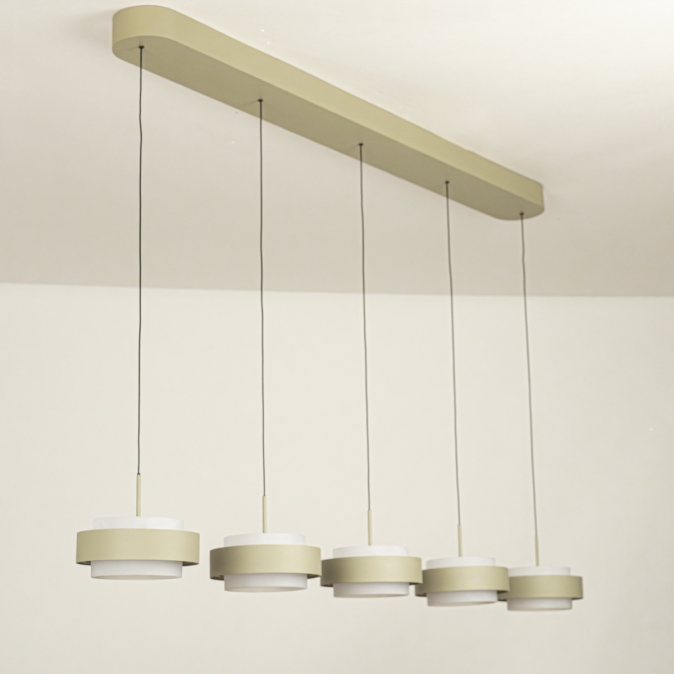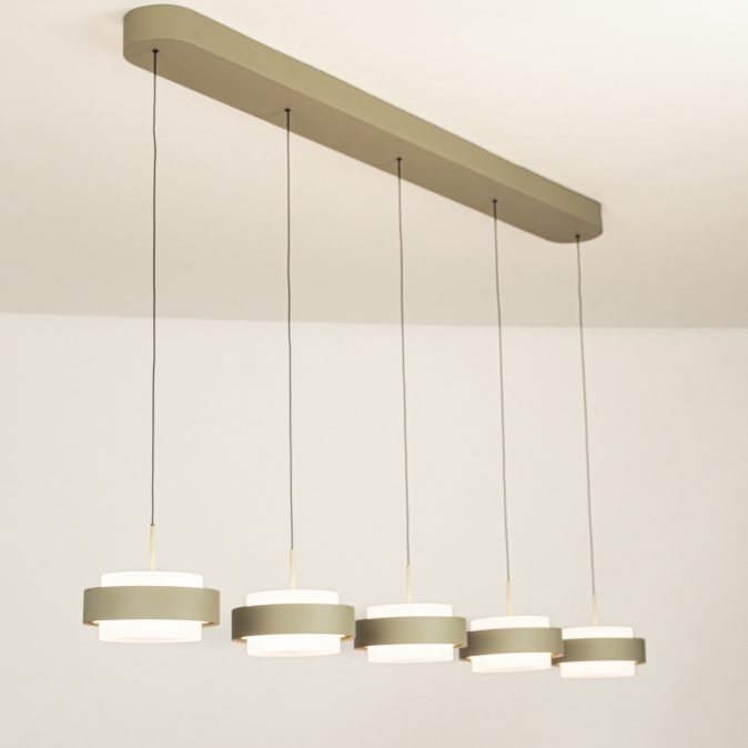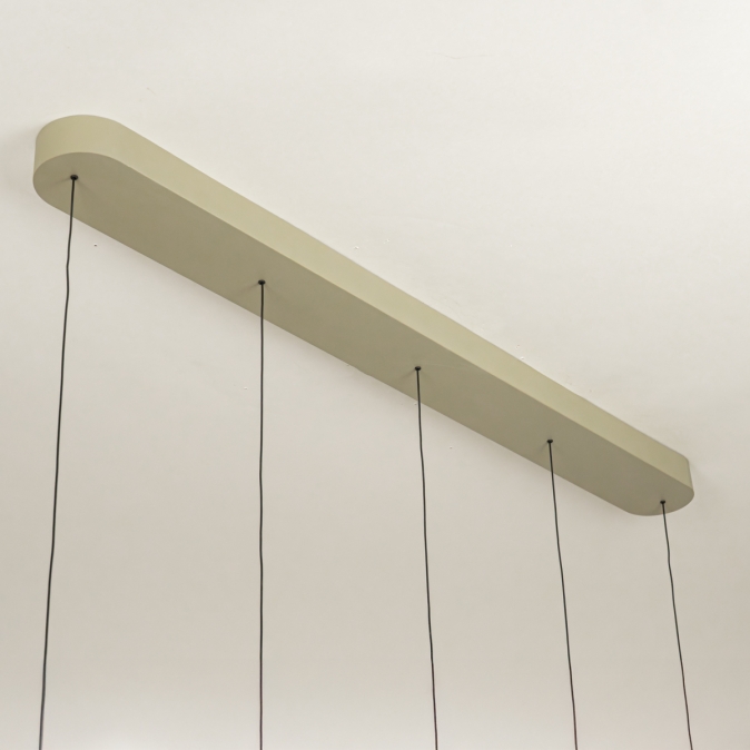 Deze 5-lichts hanglamp heeft een langwerpige plafondplaat van 120 cm en levert in totaal 5250 lumen. Dankzij de Dim to Warm-techniek wordt het licht warmer als je dimt: van 3000 naar 2200 Kelvin. Met slechts 18 Watt verbruik per kap is deze lamp energiezuinig én stijlvol. De lamp is uitgevoerd in olijfgroen gespoten metaal en is dimbaar met een LED-dimmer (niet inbegrepen), zodat je altijd de juiste sfeer kunt creëren.Lichtwaarden