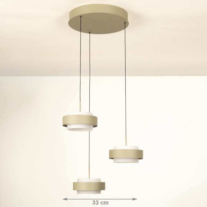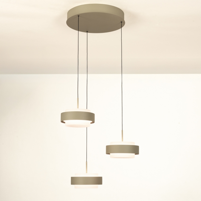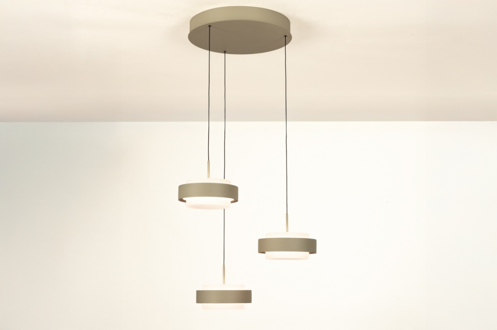 Deze 3-lichts hanglamp heeft een ronde plafondplaat van 33 cm en levert in totaal 3150 lumen. Dankzij de Dim to Warm-techniek wordt het licht warmer als je dimt: van 3000 naar 2200 Kelvin. Als de kappen omhoog staan, werkt de lamp ook als plafondlamp. Met slechts 18 Watt verbruik per kap is deze lamp energiezuinig én stijlvol. De lamp is uitgevoerd in olijfgroen gespoten metaal en is dimbaar met een LED-dimmer (niet inbegrepen), zodat je altijd de juiste sfeer kunt creëren.Lichtwaarden