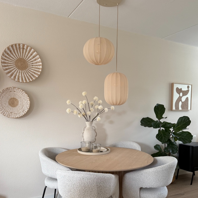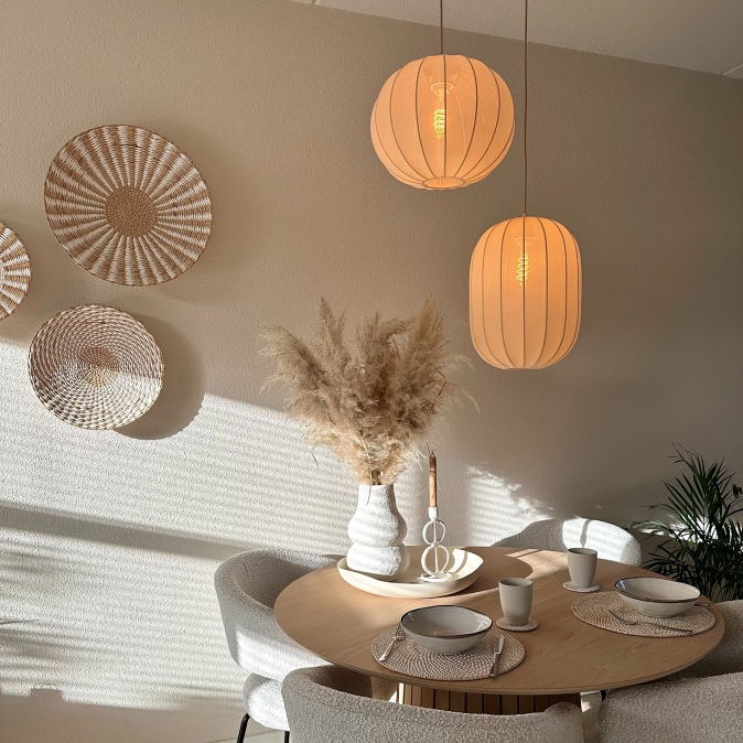Lampion lampen, we zien ze veel in trendy woonstijlen zoals Japandi en de Scandinavische woonstijl. Lampionnen hebben een zachte uitstraling en zorgen voor een serene sfeer. Deze lampion lamp heeft diezelfde zachte uitstraling als die van een lampion, maar heeft een rijkere uitstraling door de luxe beige stof (in plaats van rijstpapier). Deze dubbele hanglamp is geweldig boven een ronde eettafel, de salontafel, naast de bank (in plaats van een vloerlamp), in het trapgat of in de vide natuurlijk. Waar hang jij deze japandi hanglamp?Tip: Maak deze lamp smart door een Wifi of Zigbee-module te gebruiken en geniet direct van alle voordelen van slimme verlichting.