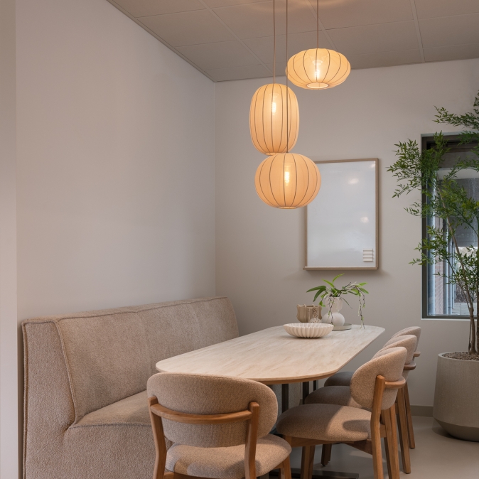Met deze grote hanglamp in japandi stijl haal je zacht licht in huis. De luxe lampionnen zijn gemaakt van een werkelijk prachtige stof in taupe. De stof heeft een fijne structuur. Precies dat zorgt voor fijn zacht licht. De lampionnen verschillen van vorm; een bol, een tulband en een ovale kap. Alle drie hangen ze aan een ronde plafondplaat in een kleur die perfect past in jouw japandi interieur of Scandinavische woonstijl. Ook het snoer verdient aandacht: niet wit of zwart, maar taupe. Zo zijn de snoeren alles behalve storend. Door de zachte tinten en de mooie ronde vormen, gaat deze lampion hanglamp op in uw interieur.Voordelen hanglamp met taupe kappen