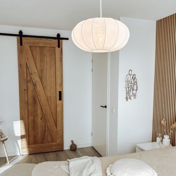Deze lampionlamp is een subtiele blikvanger die je ruimte niet overheerst, maar juist aanvult. Door de zachte belijning en de mooie, transparante stof straalt hij warmte uit, zelfs als hij uit staat. Mooi boven een wiegje, in een rustige zithoek of juist als sfeervol statement in een minimalistisch interieur. Liever wat meer sfeer in de avond? Combineer de lamp met een externe dimmer en pas het licht precies aan zoals jij het wilt.Met deze lamp haal je rust, zachtheid én stijl in huis – zonder dat het ten koste gaat van de eenvoud.