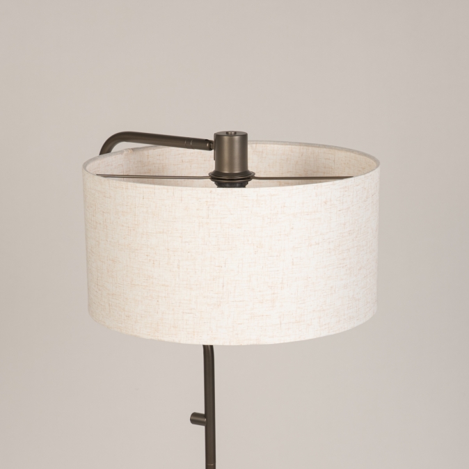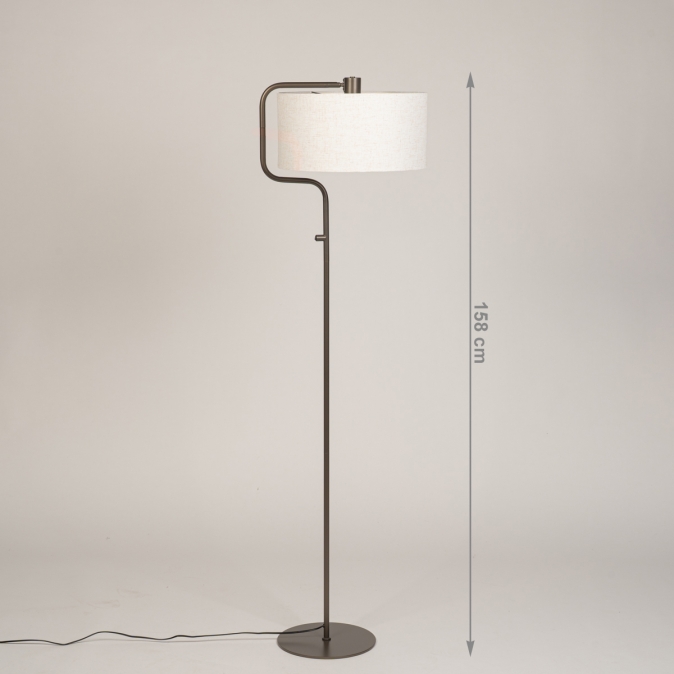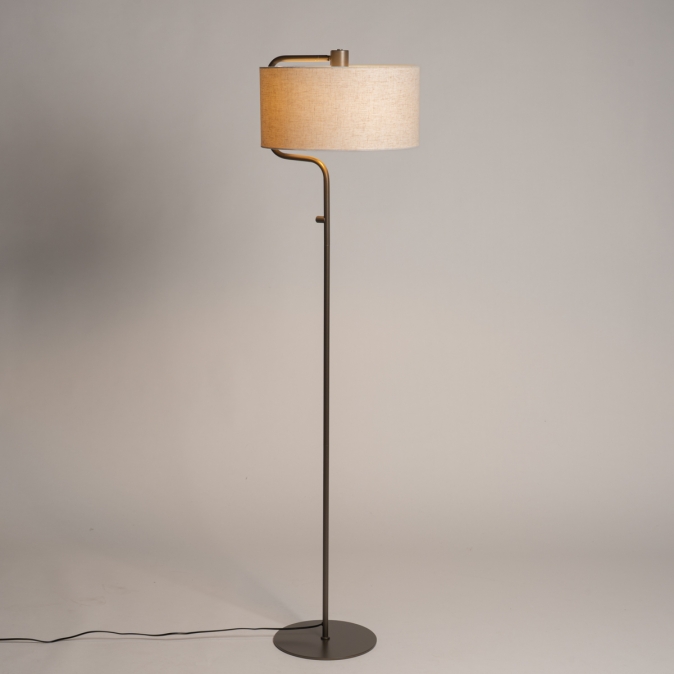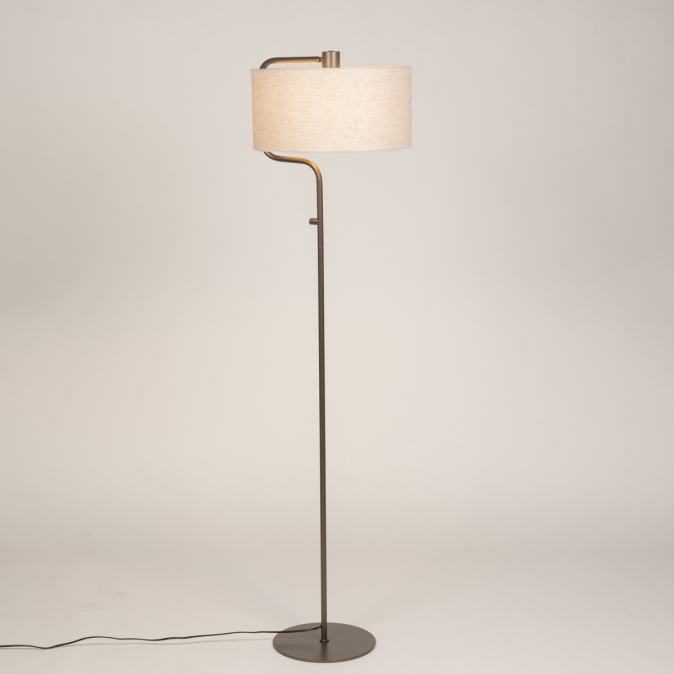 Eigentijdse bruine vloerlamp met crèmekleurige, linnen kap.