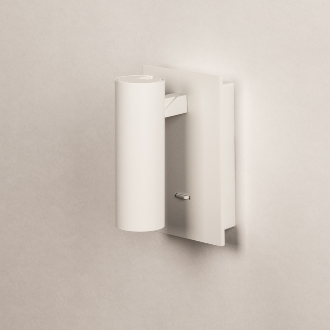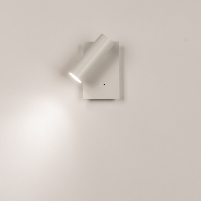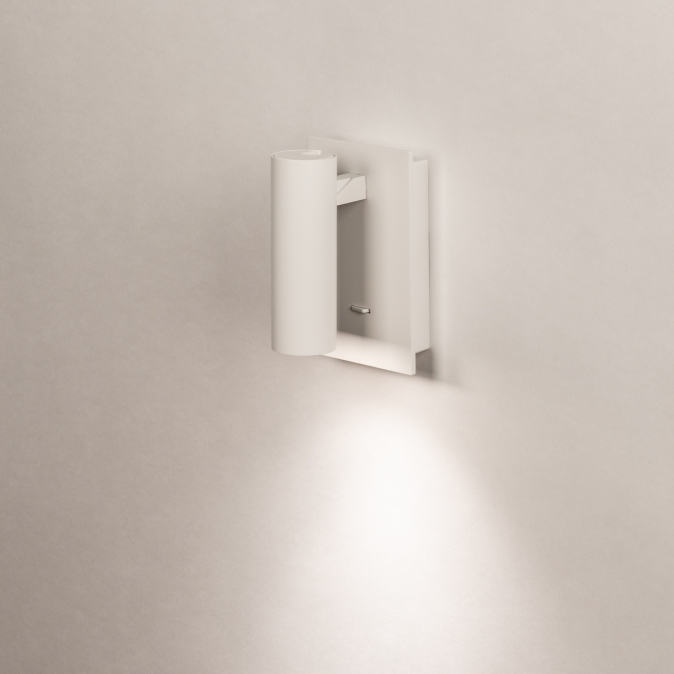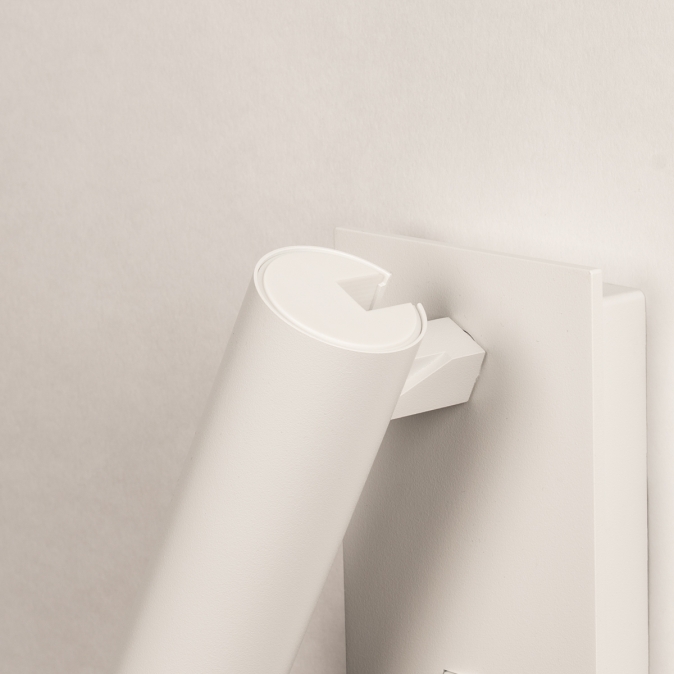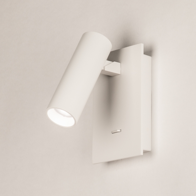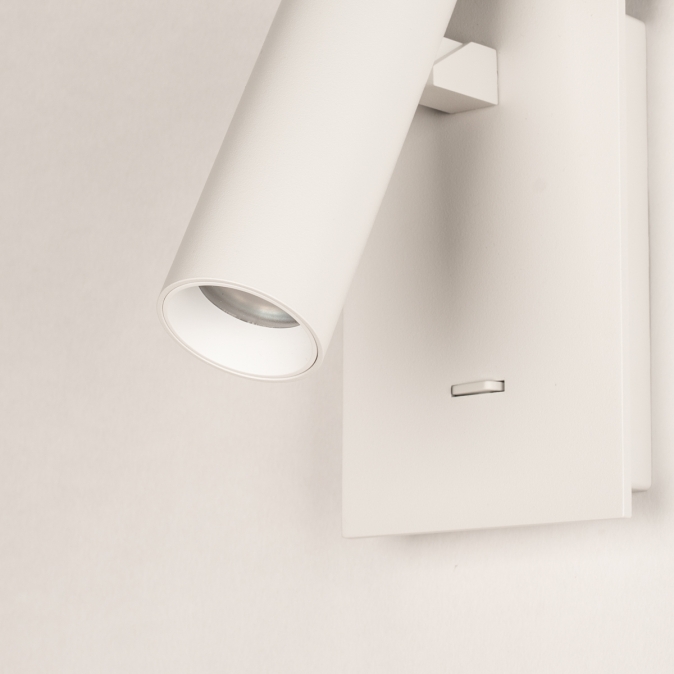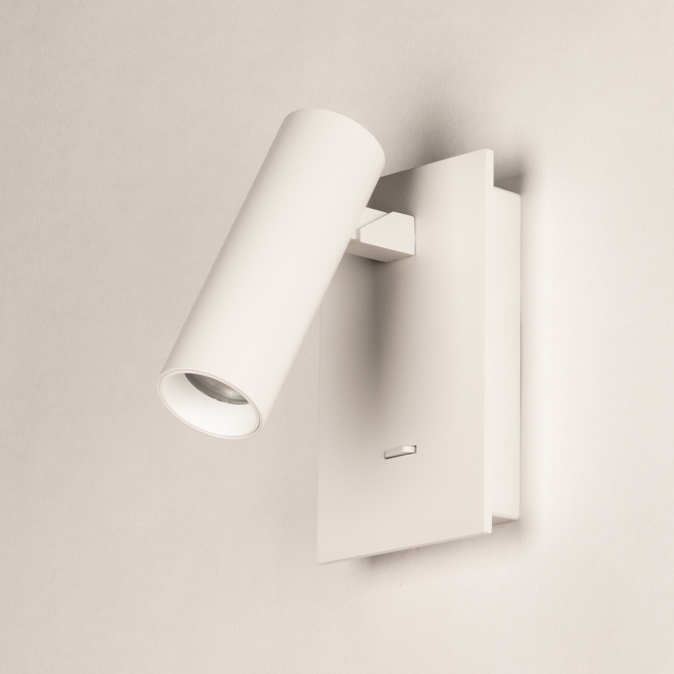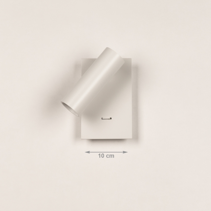 Deze moderne wandlamp is uitgevoerd in strak mat wit metaal en heeft een minimalistisch ontwerp dat perfect past in een eigentijds interieur. De cilindervormige spot ligt iets verdiept waardoor het licht een mooie gerichte bundel geeft zonder te verblinden. De spot zelf is zowel draaibaar, als kantelbaar waardoor je het licht naar wens kunt richten. De lamp is voorzien van een ingebouwde schakelaar op de wandplaat, waardoor hij ideaal is als praktische leeslamp naast of boven het bed. Deze wandlamp is ook erg goed te gebruiken als je iets wilt uitlichten, bijvoorbeeld een schilderij of kunstobject. Met dit veelzijdige wandlampje kun je alle kanten op!Voordelen van deze witte wandspot