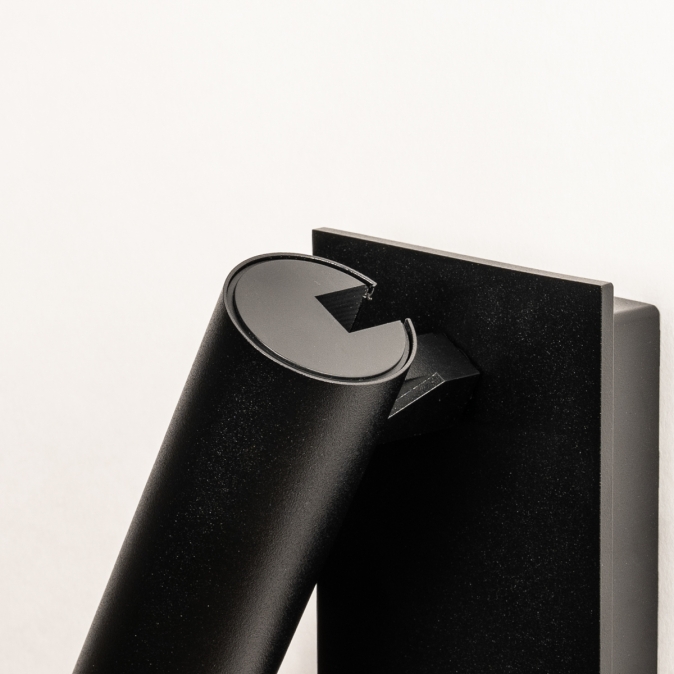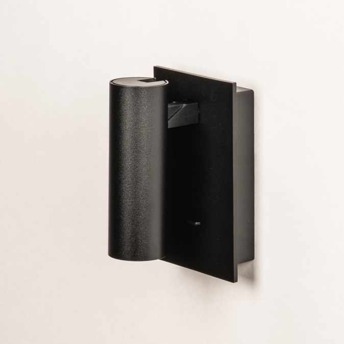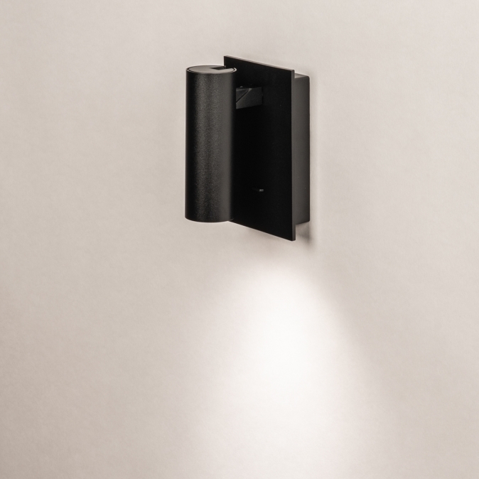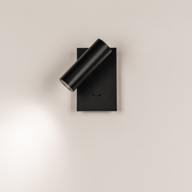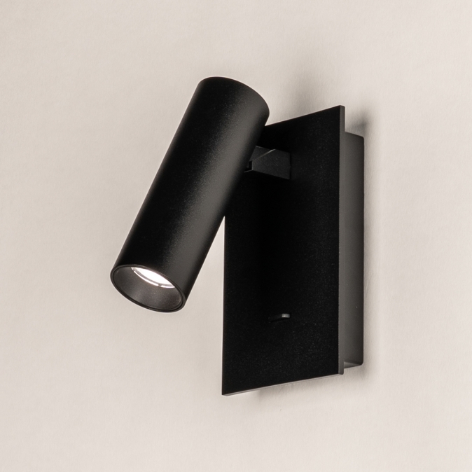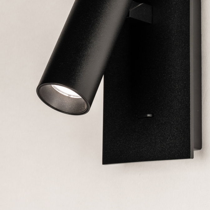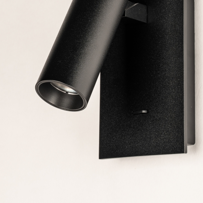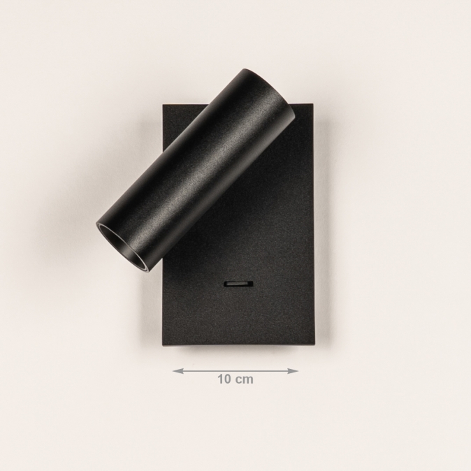 Deze moderne wandlamp is uitgevoerd in strak mat zwart metaal en heeft een minimalistisch ontwerp dat perfect past in een eigentijds interieur. De cilindervormige spot ligt iets verdiept waardoor het licht een mooie gerichte bundel geeft zonder te verblinden. De spot zelf is zowel draaibaar, als kantelbaar waardoor je het licht naar wens kunt richten. De lamp is voorzien van een ingebouwde schakelaar op de wandplaat, waardoor hij ideaal is als praktische leeslamp naast of boven het bed. Deze wandlamp is ook erg goed te gebruiken als je iets wilt uitlichten, bijvoorbeeld een schilderij of kunstobject. Met dit veelzijdige wandlampje kun je alle kanten op!Voordelen van deze zwarte wandspot
